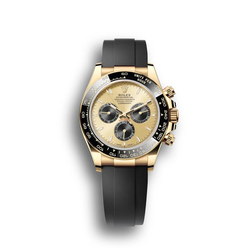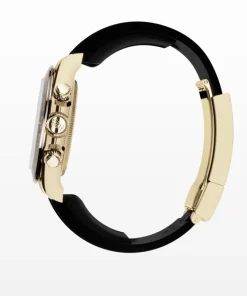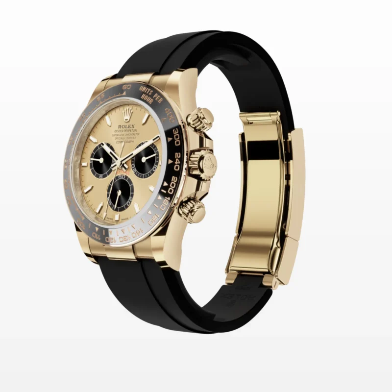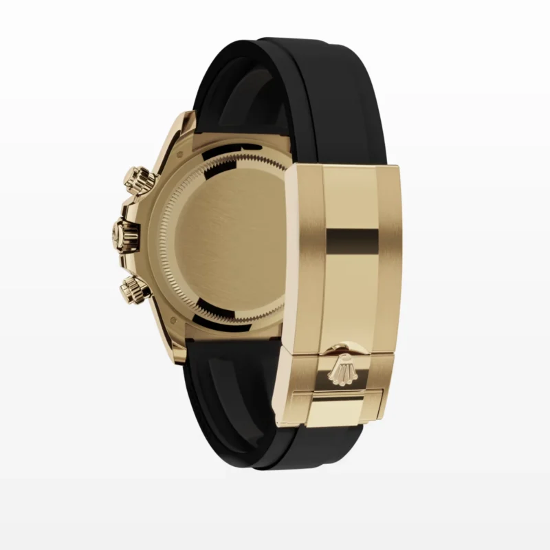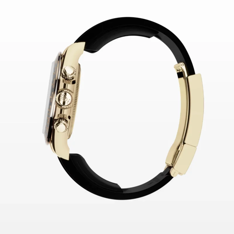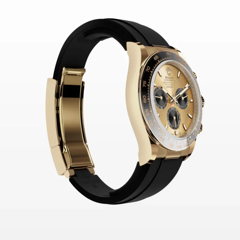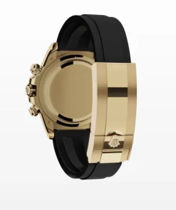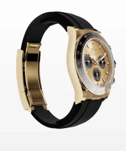 The Oysterflex bracelet, invented by Rolex and patented, is a unique feature of the imitation gold Cosmograph Daytona with Cerachrom bezel. It consists of two flexible, curved metal blades, one in each bracelet section, overmolded with high-performance black elastomer. Cushions are placed on the inner sides of the Oysterflex bracelet for maximum comfort, and it has an Oysterlock safety clasp to prevent unintentional opening. The length of the bracelet can be adjusted using the clever Rolex Glidelock extension system.