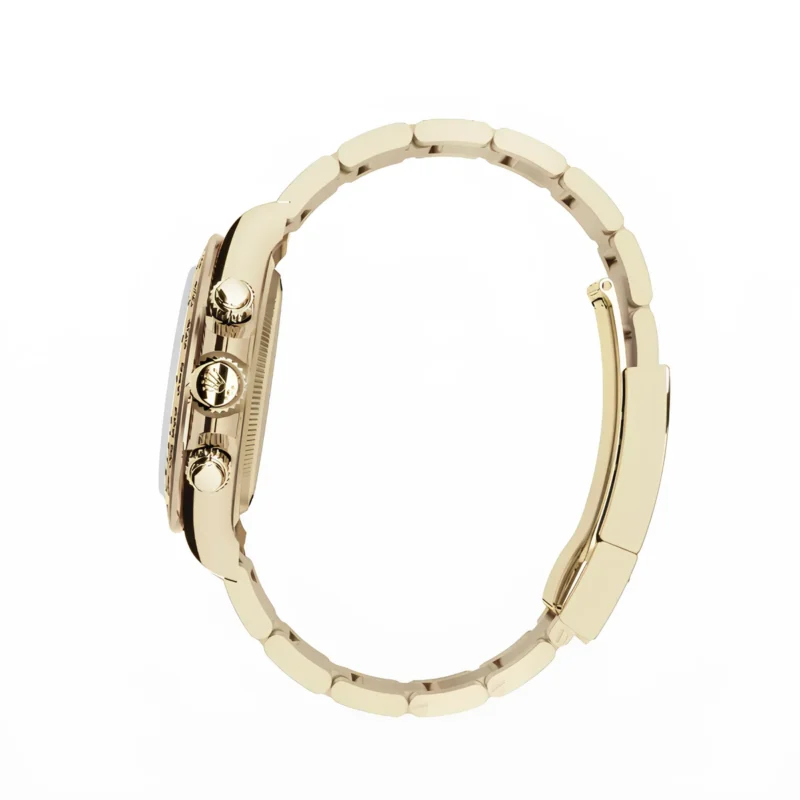 A tachymetric scale that reads average speed over a given distance based on elapsed time is featured in the bezel of the Cosmograph Daytona. This scale offers optimal legibility, making the Cosmograph Daytona the ideal instrument for measuring speeds up to 400 units per hour, expressed in kilometers or miles. The Cosmograph Daytona was designed to be the ultimate timing tool for endurance racing drivers.